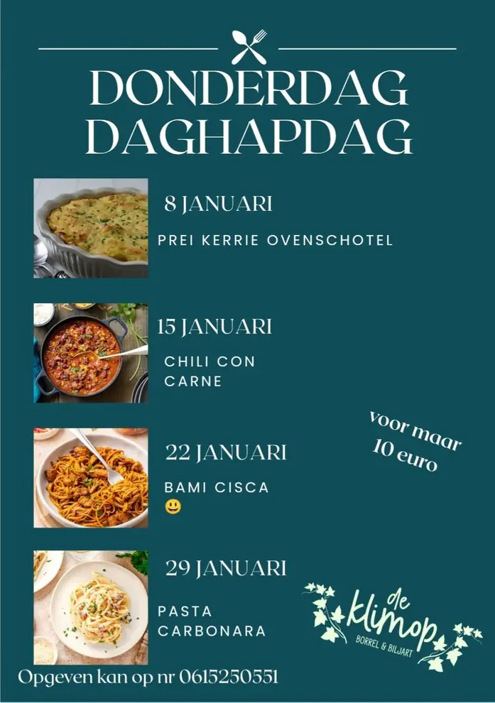 Wil je de daghap afhalen en lekker thuis opeten? Dat kan ook. Laat ons wel even op tijd weten dat je de daghap afhaalt.